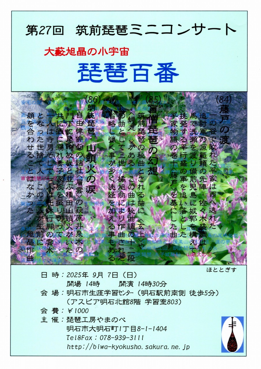 第4回 筑前琵琶ミニコンサート ~琵琶百番 大藪旭晶の小宇宙 この度の演目は〈須磨の知盛〉〈舞扇鶴ヶ岡〉 そして〈明石)これは源氏物語の十三帖を基に 母の子供時代からの友人で歌人の方から頂いた 歌詞に 曲付けをしたものです |
