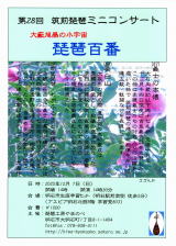 第18回筑前琵琶ミニコンサート 琵琶百番 大藪旭晶の小宇宙 この度は次の3曲を演奏しました ①五条橋・・鎌奥州の衣川で義経と最期を遂げた弁慶 京都の五条橋での二人の最初の出会いの逸話を琵琶歌にしたもの ②吉野山懐古・・室町時代の始め 朝廷は南北に分裂し 約60年間南朝は吉野に置かれた その南朝を偲び詠われた曲 ③柳の精・・浄瑠璃の「三十三間堂棟の由来」を基にした曲 木に宿る精霊 親子の情 夫婦愛などが詠われている |
