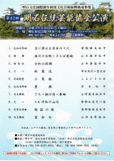 明石伝統芸能協会 第40回記念公演 日本の伝統芸能を 明石市内および近隣で 教 授又は教室を開講の職格者で組織されるこの 会は 今年40回目の公演を開催しました 五年毎の記念公演には ゲストをお招きしてい て今年は 狂言の「茂山狂言会」の四人の先生 方の特別公演があり 〈蝸牛〉を演じて頂きま した この度は同門の石尾・右手さんと共に 羽衣伝説に基づいた琵琶曲〈天の羽衣〉を演 奏しました |