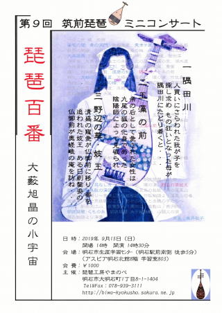 第4回 筑前琵琶ミニコンサート ~琵琶百番 大藪旭晶の小宇宙 この度の演目は〈須磨の知盛〉〈舞扇鶴ヶ岡〉 そして〈明石)これは源氏物語の十三帖を基に 母の子供時代からの友人で歌人の方から頂いた 歌詞に 曲付けをしたものです |